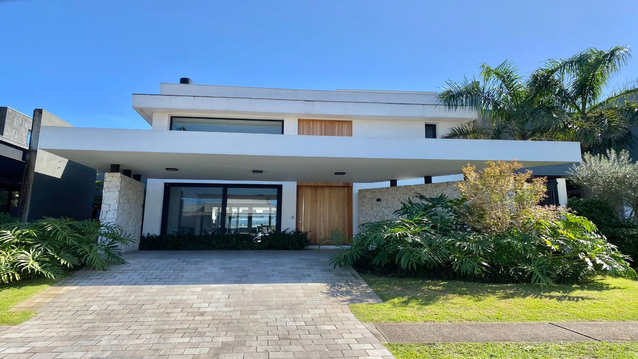 Belíssimo sobrado beira lago e vista permanente do pôr do Sol, com quatro suítes, sendo uma térrea, lavabo, área social com 72m² integrada ao espaço externo e piscina, cozinha gourmet com móveis Todeschini, lavanderia e depósito. Piscina de concreto com espera para aquecimento solar/mecânico; esquadrias em pvc e persianas automatizadas. Luminárias internas e externas; espera para instalação fotovoltaica; mobília de alto padrão; climatização e aquecedores de água instalados; jardim com irrigação automatizada.