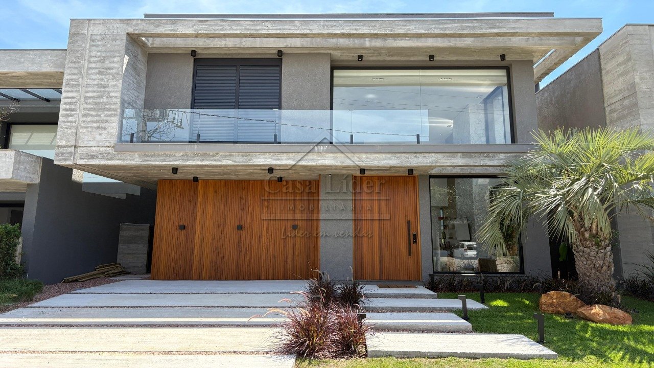 Sobrado mobiliado e decorado com 265 m² de área construída, mais 18 m² de piscina de alvenaria. Conta com 4 suítes, sendo uma delas no térreo, além de um lavabo interno para a casa e um lavabo externo para a área da piscina. A piscina é de alvenaria, completa e automatizada. O imóvel possui esquadrias de PVC preto com vidros duplos na parte superior, equipadas com telas mosquiteiras e persianas elétricas. As louças e metais são das marcas Deca e Rocca. O abrigo tem capacidade para 2 carros.