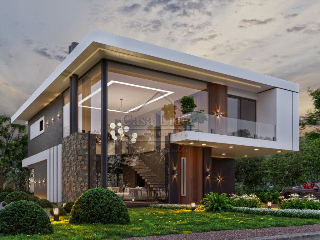 Sobrado com 380m², composto por 5 suítes, living integrado com lareira, cozinha com área gourmet, lavabo, área de serviço, varanda nos fundos, piscina e vaga para veículos.