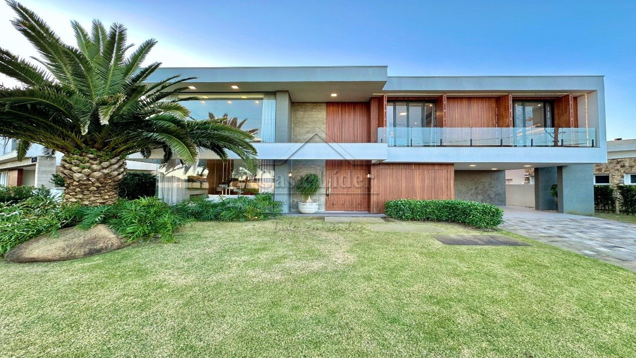 Casa contemporânea beira lago, com 6 suítes com sacada e vista para o lago, suíte máster com closet e banheira de hidromassagem, uma suíte térrea, amplo living com ambientes decorados e pé direito duplo, espaço gourmet, varanda com vista para o lago, cozinha separada mobiliada e equipada, dependência de empregada, estar íntimo no mezanino, elevador, esquadrias em PVC com tela mosquiteiro, split em todos os ambientes, piscina de concreto com borda infinita e abrigo para veículos.