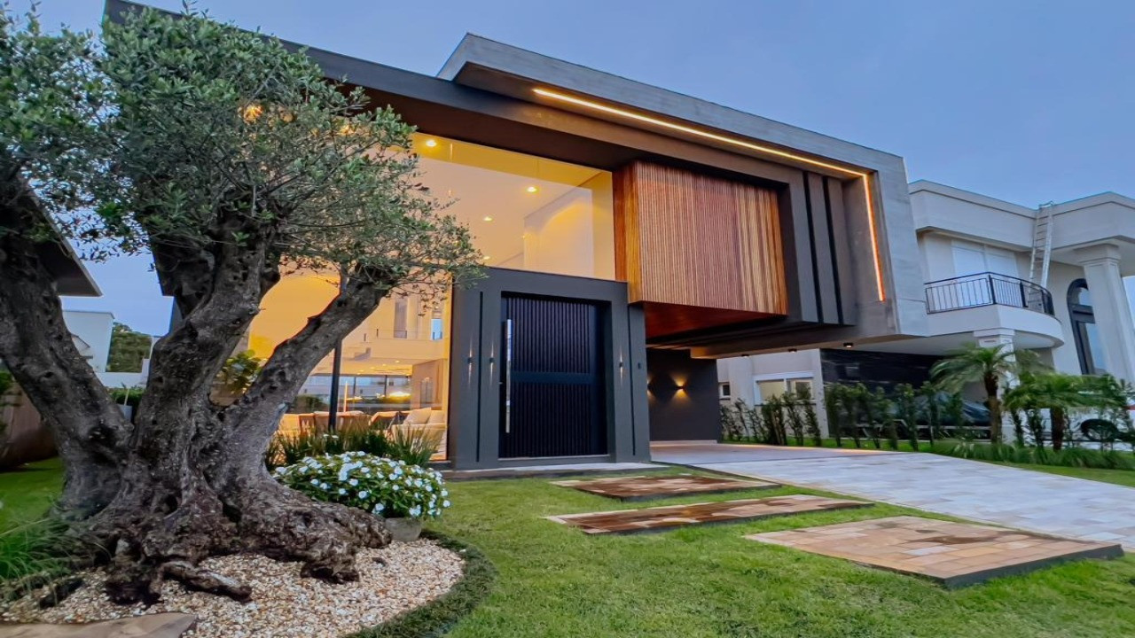 Belíssimo sobrado com 337m², composto por 5 suítes, living integrado em 3 ambientes, cozinha americana com churrasqueira, adega, piscina e abrigo para carros.