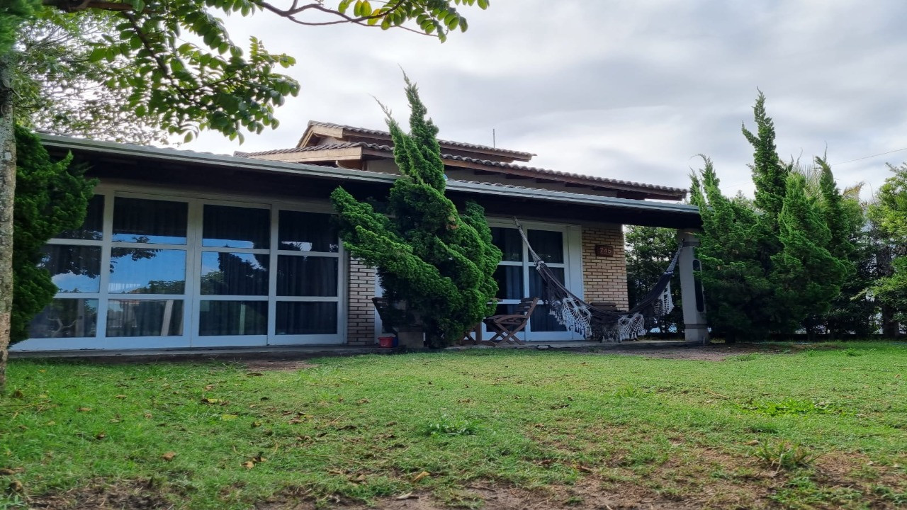 Casa com três dormitórios sendo uma suíte master com hidromassagem, living em três ambientes, lareira, cozinha com churrasqueira, piscina com deck em madeira, sistema de água quente com aquecedor a gás, pressurização da água com caixa d'água, muro de vidro, poço artesiano, pé direito alto com teto todo em madeira nobre, telha de concreto, mobiliada, estacionamento interno para três carros.