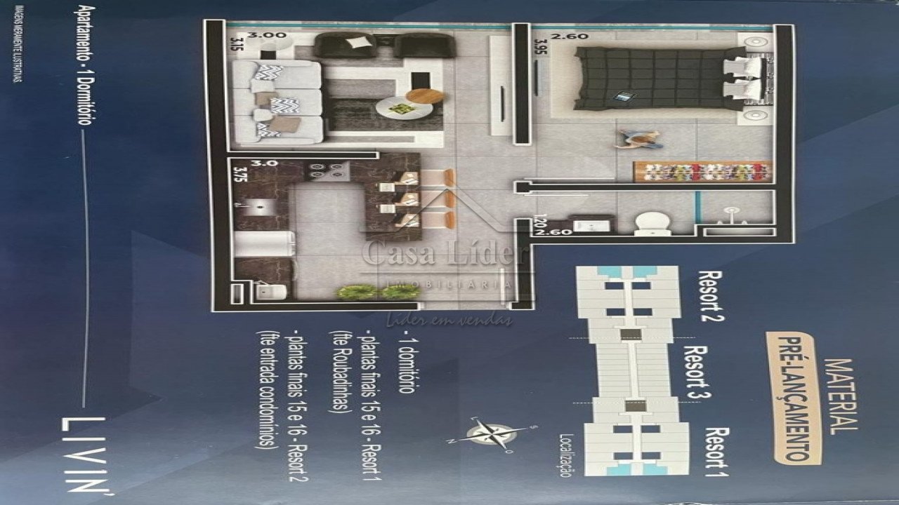 Lindíssimo apartamento com aproximadamente 74 m² no centro da praia de Atlântida. Conta com um dormitório, banheiro, sala e cozinha estilo americana.