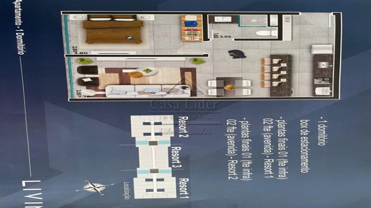 Lindíssimo apartamento com 88,60m2 área total, localizado no centro da praia de Xangri-lá. Conta com um dormitório, banheiro, sala e cozinha estilo americana integrados.