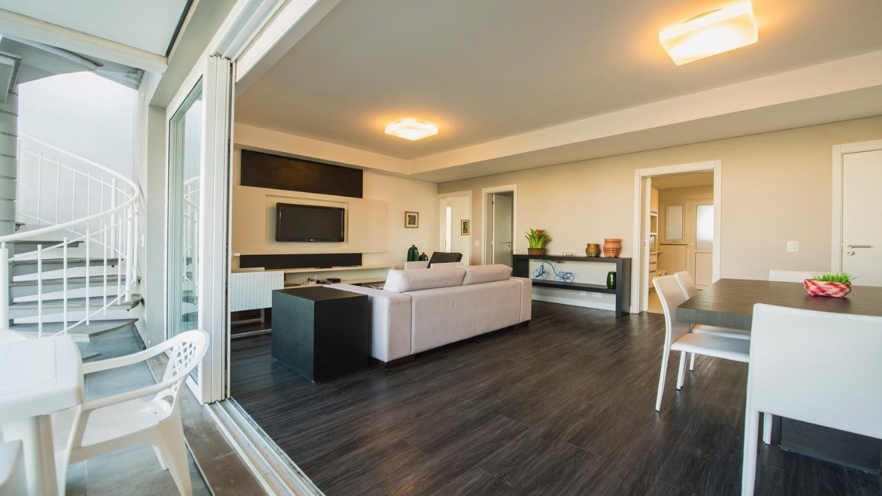 Cobertura com três dormitórios, sendo uma suíte, living com dois ambientes, sacada com churrasqueira, cozinha completa, lavanderia, ar condicionado em todos os quartos, água com aquecedor a gás e dois boxes de garagem.